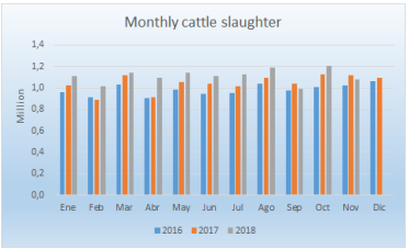 阿根廷十一月總共屠宰108.1萬頭牛,比十月少9%,不過算前十一個月的話,總共屠宰1221.6萬頭,比2017年多7%,產(chǎn)能最大的13廠十一月屠宰量下降很多,被1920廠超過只能排第二,三至五名分別是2025,2082和COTO。