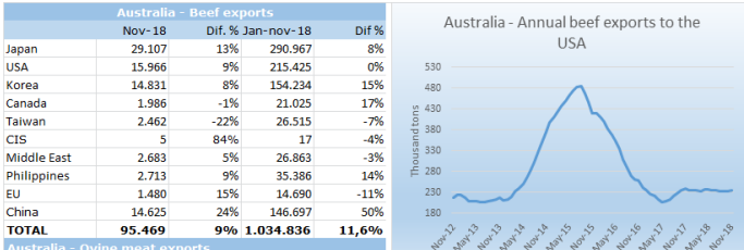 近十二個月牛肉出口總值達到16億美金,如果算上副產(chǎn)品和成品,總值達到19.4億美金,比2017年高4%,出口總量方面跟2017年相差不多,大約45萬噸。