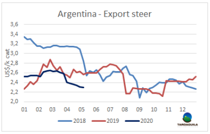 雖然在隔離令開始時,阿根廷國內市場的牛肉消費出現(xiàn)反彈,但隨著實行社會補貼,最初的熱情逐漸消退。一位市場專家指出,這些天來,恐慌累積導致許多產品的需求下降,原因是家庭預算問題,信用卡的使用時間縮短到月底。牛肉是受到影響的一種商品,價格與國外市場相比很低,本地也沒有其他的食物的競爭,這反映出供應多而價格下跌。此外閹牛的需求端出現(xiàn)問題,國內需求僅能消費牛肉產量的四分之三。