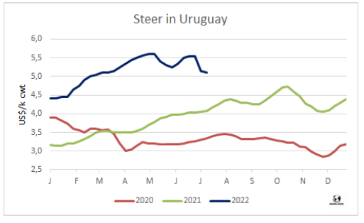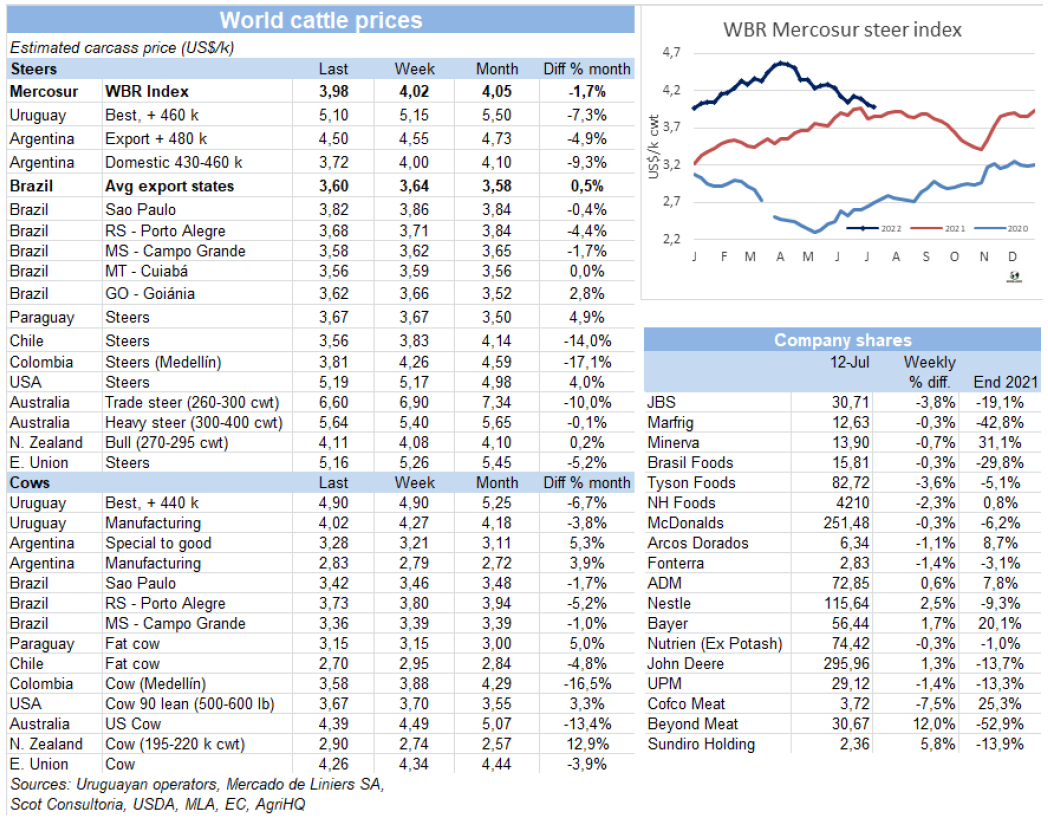 五家工廠暫停屠宰活動(dòng)加上一些還在進(jìn)行屠宰活動(dòng)的工廠減產(chǎn),導(dǎo)致牛屠宰量下降至2020年末至今一年半以來(lái)的最低水平。烏拉圭肉協(xié)報(bào)告,截止7月9日,一周內(nèi)牛屠宰量29829頭,環(huán)比減少了1萬(wàn)多頭,減幅約25%。同比減少了2.1萬(wàn)頭,減少了42%。屠宰量較上周下降是由于閹牛屠宰量下降了約28%至14561頭,母牛屠宰量較上周下降了17%至10506頭。小母牛屠宰量下降了17%至4297頭。屠宰量最高的工廠是Las Piedras,379廠,屠宰量 5022頭, Marfrig-Cledinor,394廠,屠宰量 3180頭和Ontilcor 439廠,屠宰量3,041頭。美麗華三家屠宰場(chǎng)屠宰量累計(jì)6553頭,Marfrig兩家屠宰場(chǎng)累計(jì)屠宰量5735頭。本周烏拉圭2廠,104廠等一些上周暫停的屠宰場(chǎng)恢復(fù)屠宰, 12廠,344廠,310廠仍未恢復(fù)屠宰。美麗華7廠屠宰持續(xù)至昨天,將暫停屠宰直至八月中旬。本周屠宰量將繼續(xù)保持低水平,不過將較前一周的低點(diǎn)有所提高。