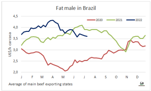 六月馬托格羅索州牛屠宰量44.55萬(wàn)頭,環(huán)比增長(zhǎng)了2萬(wàn)頭,同比增長(zhǎng)了3.4萬(wàn)頭。公牛屠宰量24.9萬(wàn)頭,母牛屠宰量19.7萬(wàn)頭。公牛屠宰量與2021年6月基本持平(-0.4%),母牛屠宰量增加了3.5萬(wàn)頭。母牛屠宰量的增長(zhǎng)證實(shí)了巴西正從2020年和2021年的保留存欄階段轉(zhuǎn)向降低存欄階段。但是,據(jù)Agrifatto表示,今年巴西正處于這兩個(gè)周期階段之間的過渡時(shí)期,該機(jī)構(gòu)預(yù)測(cè),到2023年母牛屠宰量將高于今年。馬托格羅索州是巴西屠牛量最大的州,約占總屠宰量的20%。