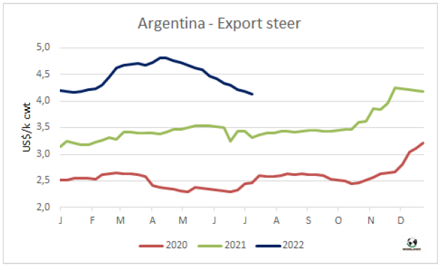 周二,受俄羅斯石油對(duì)歐盟國(guó)家斷供影響,歐元兌美元匯率跌至20年以來(lái)最低水平。投資者更青睞美元,自今年年初以來(lái)美元已經(jīng)上漲了近14%。阿根廷希爾頓臀腰肉價(jià)格受此影響下跌,過去一周內(nèi)下跌了500美元/噸。據(jù)市場(chǎng)參與者反映,13000美元/噸已經(jīng)是成交價(jià)的天花板了。有一位歐洲進(jìn)口商還價(jià)13000-13500美元/噸,本周初其他進(jìn)口商給新發(fā)船的阿根廷產(chǎn)品還價(jià)在12700-12800美元/噸。烏拉圭方面,受屠宰量急劇縮減的影響,供應(yīng)有限,參考價(jià)12500美元/噸。