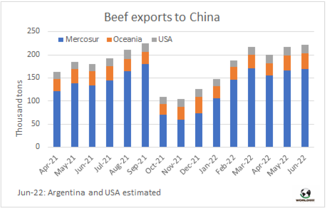 6月份,中國(guó)牛肉的主要供應(yīng)國(guó)發(fā)船量仍然很大。據(jù)估計(jì),南方共同市場(chǎng)、澳洲和美國(guó)牛肉出口量達(dá)22.1萬(wàn)噸,非常接近2021年9月22.4萬(wàn)噸的最高峰值。據(jù)估計(jì)從南方共同市場(chǎng)發(fā)貨量約17萬(wàn)噸,其中從巴西發(fā)貨量超過10.3萬(wàn)噸。此外,從澳洲發(fā)貨量3.3萬(wàn)噸,從美國(guó)發(fā)貨量1.8萬(wàn)噸,與3-5月的出貨水平相當(dāng)。這些貨物量大多在7月下半月到8月之間抵達(dá)中國(guó)。