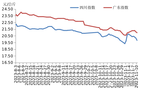 本周,四川豬肉周均價為每公斤20.23元,環(huán)比上漲1.2%,同比下跌39.7%,較上周收窄2.3個百分點(diǎn)。周前期,川內(nèi)散養(yǎng)戶出欄積極性偏低,加之批發(fā)市場豬肉到貨量減少,支撐豬肉價格小幅上漲。周后期,因終端消費(fèi)能力有限,白條豬肉銷售速度放緩,豬肉價格下跌??傮w看,四川地區(qū)豬肉周均價環(huán)比小幅上漲。