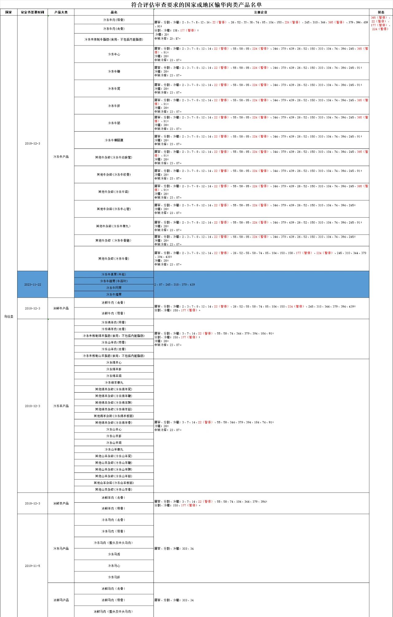 2024年5月9日,新增烏拉圭4家牛肉產(chǎn)品信息,分別是:冷凍牛真胃(牛肚)、冷凍牛瓣胃(牛百葉)、冷凍牛網(wǎng)胃、冷凍牛瘤胃;注冊工廠號為:2、87、245、310、379、439。
