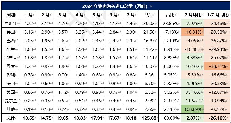 2024年1-7月冷凍豬肉進口概況