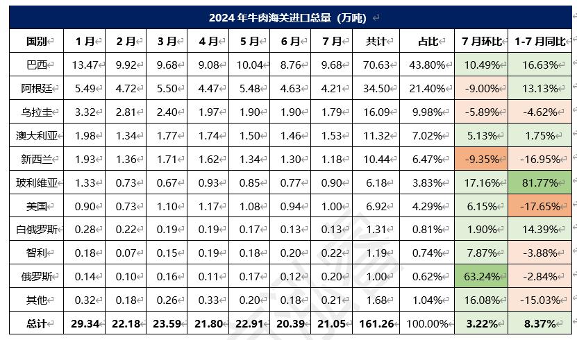 2024年1-7月冷凍牛肉進口概況