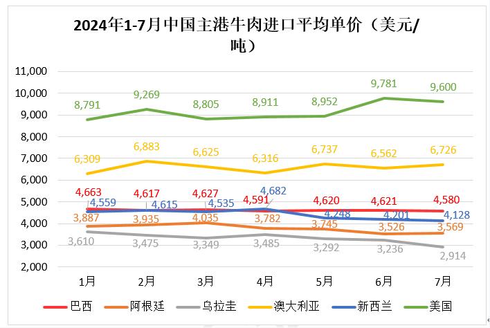 從進口單價看,巴西1-7月平均單價為4620美元/噸,去年同期為5283美元/噸,阿根廷1-7月平均單價為3794美元/噸,去年同期為4303美元/噸,烏拉圭1-7月平均單價為3373美元/噸,去年同期為4161美元/噸,美國1-7月平均單價為9140美元/噸,去年同期為8485美元/噸。各國進口平均單價為4618美元/噸,去年同期為5232美元/噸??傮w來看,牛肉進口單價同比均呈下降趨勢。