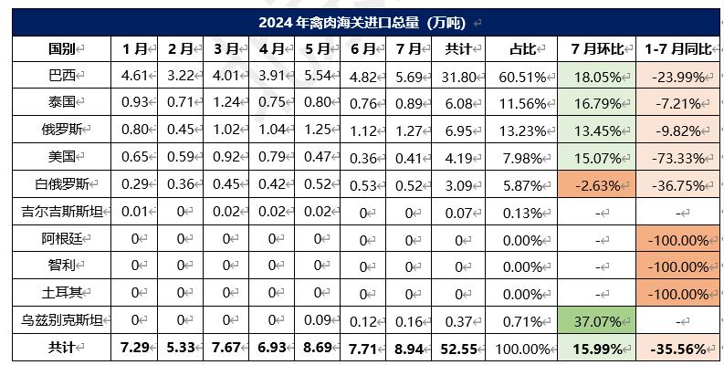 2024年1-7月冷凍禽肉進口概況
