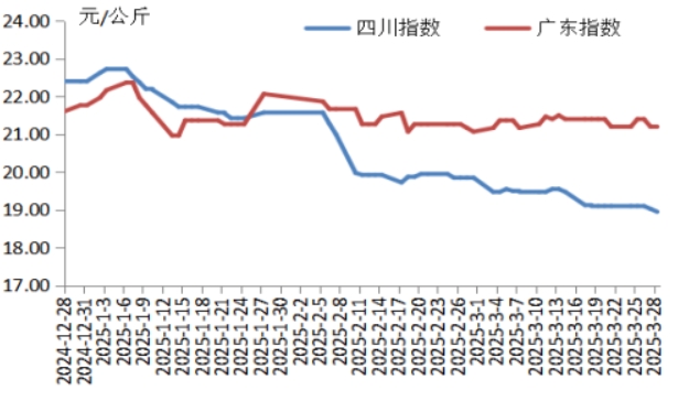 本周,廣東地區(qū)豬肉周均價(jià)為每公斤21.28元,環(huán)比下跌0.4%,同比下跌1.1%,結(jié)束了同比上漲趨勢(shì)。周前期,生豬供應(yīng)較為平穩(wěn),屠宰企業(yè)按需收購(gòu),生豬及豬肉價(jià)格以穩(wěn)定為主;周中期,散養(yǎng)戶和規(guī)模養(yǎng)殖場(chǎng)出欄節(jié)奏放慢,生豬及豬肉供應(yīng)短時(shí)收緊,支撐豬肉價(jià)格小幅反彈;周后期,周邊市場(chǎng)豬肉價(jià)格下跌,本地區(qū)經(jīng)銷商和消費(fèi)者壓價(jià)采購(gòu),屠宰企業(yè)為保證銷量降低售價(jià)??傮w看,廣東地區(qū)豬肉周均價(jià)環(huán)比微跌。